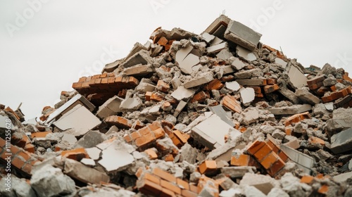 Pile of Crumbling Construction Debris with Broken Bricks, Concrete Pieces, and Fragments Against a Dull Sky in an Urban Environment