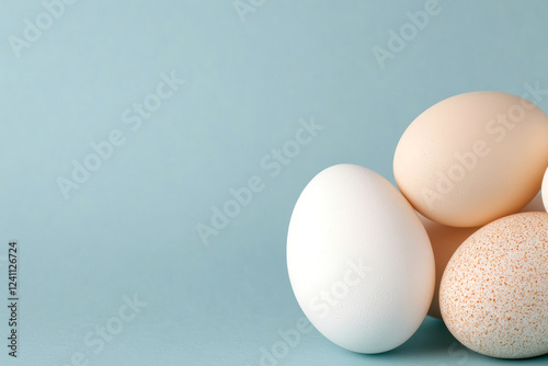 Pile of natural eggs with brown and white shells against soft pastel blue background