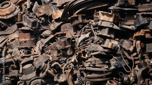 Pile of old machine parts in second hand machinery shop, background of damage and rusty old car machine