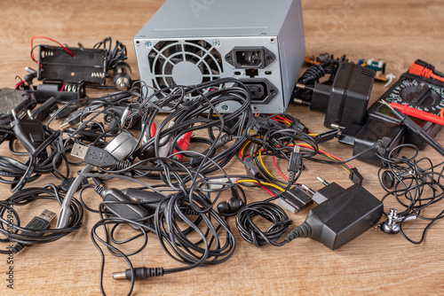 Pile of old wires, connections, headphones and chargers on a wooden table close-up. Replacement of old elements and parts of electronic devices. Repair of broken electronic devices and their elements