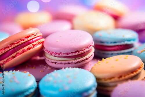 pile of pastel macarons on pink and blue sparkly bokeh studio background