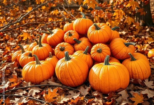 Pile of pumpkins on autumn leaves, with fallen branches and sunlight, pumpkins, image