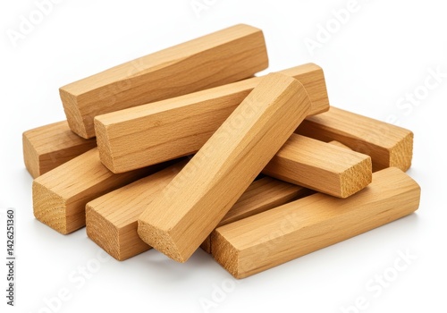 Pile of sandalwood sticks with warm golden hue and fibrous texture on white background
