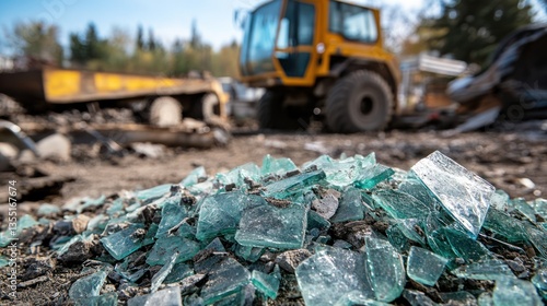glasses, shard, broken, shattered, debris, debris, demolition, destruction, waste, recycling, disposal, scrap, hazard, danger, accident, damage, injury, safety, caution, site, ground, earth, dirtied, dirt, dust, piece, fragment, texture, material, transparent, green, blue, colours, sharp, jagged, rough, uneven, surface, background, foreground, sharpened, blurry, machine, vehicle, equipment, heavy, industry, construction