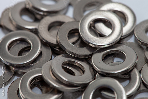 PIle of shiny screw washers.. Steel washers for screws used in carpentry and handicrafts for industrial.A lot of washers for fasteners. Heap of stainless shims. Background. PIle of shiny screw washers