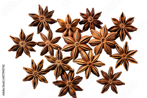 Pile of star anise in PNG style with transparent background, top view, aromatic spices for cooking and baking, isolated star anise cluster