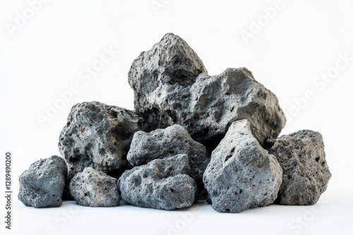Pile of Vulcanic Rocks on White Background - A collection of unique volcanic rocks showcasing various textures and shapes, symbolizing nature, geology, earth, minerals, and energy