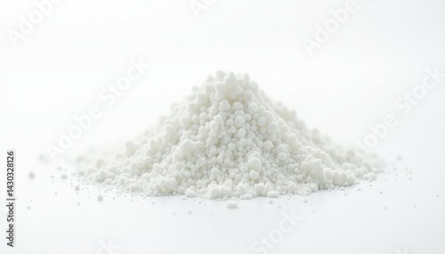 Pile of white granulated sugar on white background, crisp, sweetner, confectionery