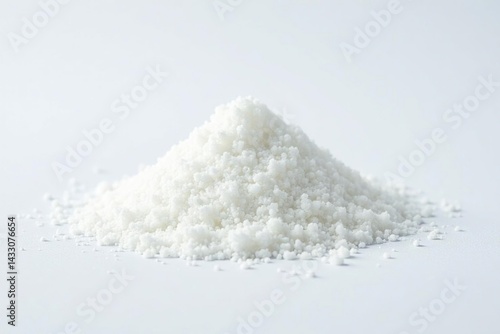 Pile of white granulated sugar on white background, sugar bowl, texture