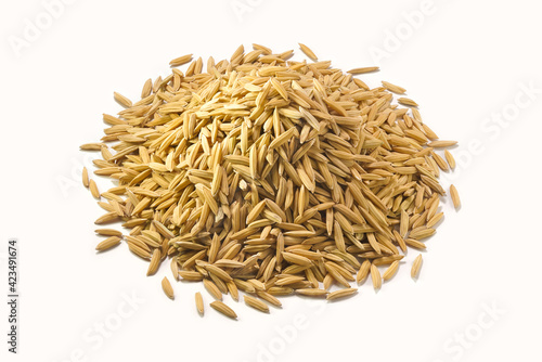 Pile of yellow gold rice. Macro of long paddy rice grains can use for background and texture. Close up of natural rice realistic closeup photo image.
