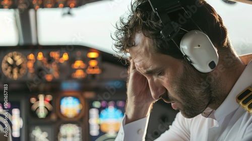 Pilot sitting in cockpit, looking frustrated and holding head, surrounded by flight instruments and control panels, capturing stress and responsibility in aviation, pilot error concept.