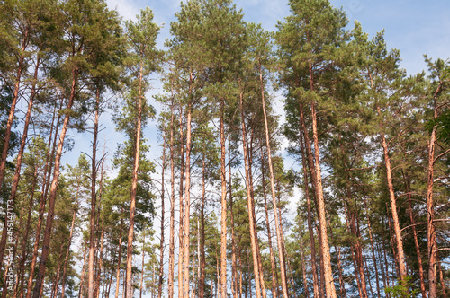 Pine forest on a warm sunny day on a background of blue sky. Quality image for your project