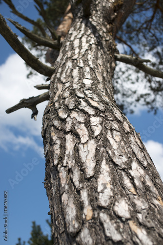 fragment, vertical, pine, tree, trunk, sunny, day, bark, nature, blue, sky, big, huge, plant