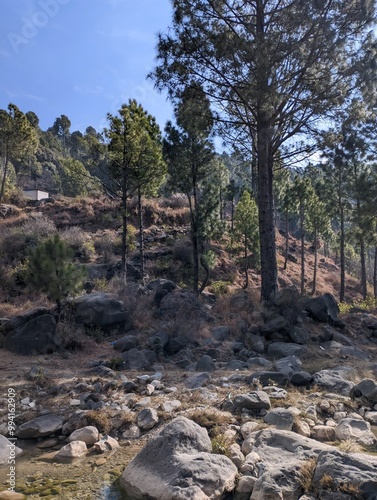 mountain, forest, rock, stream, blue skies, rural, nature, hiking, scenic, beautiful, green, vegetation, foliage, geology, countryside, wilderness, landscape, photo