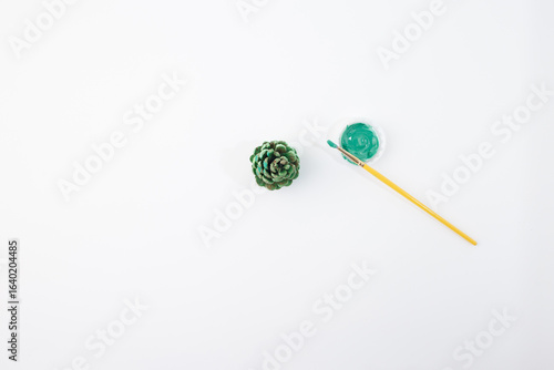Pinecone painting with green paint and yellow brush on white surface for handmade seasonal decor makers, craft supply companies, educational kits, and nature-themed hobby or gift retailers,