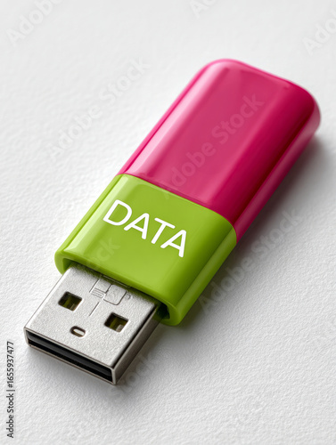 Pink and green USB flash drive labeled 'DATA' on white background.