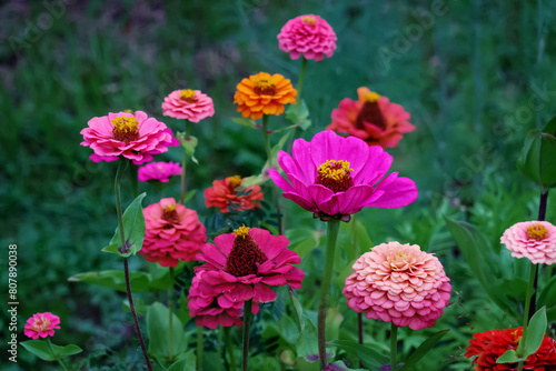 Pink and purple zinnia flowers growing in garden, botanical floral background
