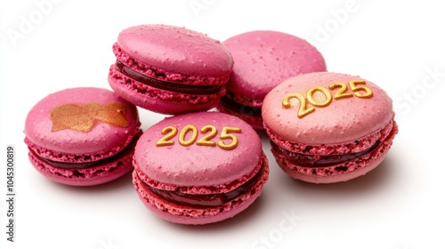 Pink and red Valentine macarons with "2025" in gold icing, isolated on white background
