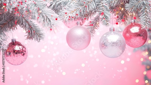Pink and silver Christmas ornaments hanging on a snowy fir branch against a soft pink background.