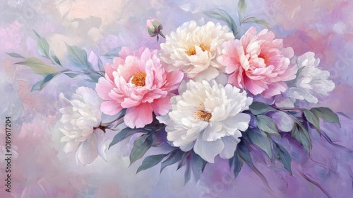 Pink and white peonies on a pastel violet background, soft and feminine generative ai
