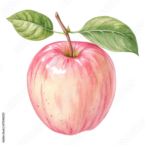 Pink apple with stem and green leaves watercolor painting isolate fruit