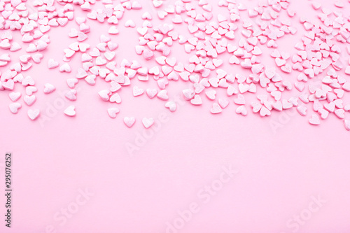 Pink background. Pink hearts on a pink background. Hearts sprinkles. Flat lay style. Top view. Place for design. Sweet background. Confetti.