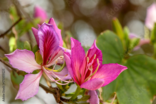 Pink Bauhinia purpurea flowers blooming in Cyprus