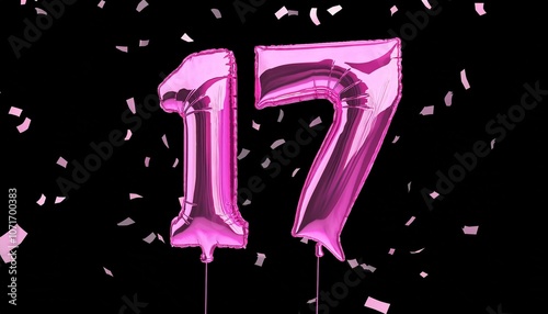 Pink birthday / anniversary balloon, number 17, black background with confetti