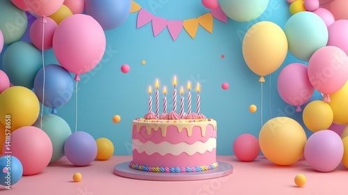 cake, birthday, balloon, candle, pastel, celebration, party, pink, sweet, festive, dessert, food, happy, joy, fun, children, girl, boy, children, event, holiday, anniversary, sweetness, delicious, deliciously, treat, gift, surprise, wish, gathering, friends, family, love, happiness, cheerful, bright, colourful, background, image, design, graphic, illustration, decor, digital, cute