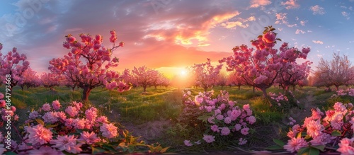 fruit farm, cherry, blossom, flower, pink, sunset, gold, sky, tree, green, grass, spring, nature, field, light, cloud, beautiful, vibrant, colourful, lush, landscape, panorama, scenic, view, romantic, tranquil, peaceful, serene, gorgeous, breathtaking, charming, majestic, blooming, fresh, joy, wonder, honed