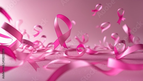 Pink Breast Cancer Awareness Ribbon. Floating pink ribbons against a pink backdrop. Awareness for breast cancer and October Pink day. Aerial view. Mock-up.