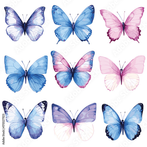 pink butterfly watercolor on white background Set of blue butterflies positive quote motivational etc fashion prints , vector style simple color