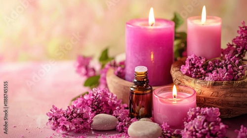 Pink candles and lilac flowers create a serene and relaxing atmosphere. A bottle of essential oil adds to the spa-like ambiance.