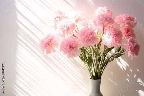 Pink Carnations Bouquet on White Wall Background with Sunlight Shadows for Home Decor