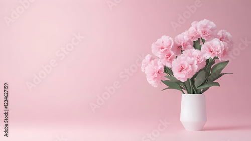 Pink carnations in white vase, pink background, minimalist floral arrangement, greeting card design