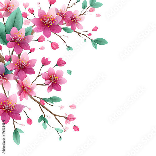 flower, cherry blossom, pink, vibrant, elegant, blooming, tree branch, leaf, bud, natural, flora, botanical, spring, flowering, flower petals, colourful, delicate, fresh, beautiful, nature, design, decorative, background, visual, artistic, minimalist, closeup, nature scene, floral arrangement, high-coloured