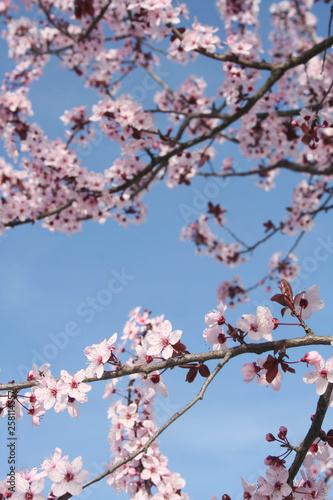 Pink Cherry flowers on branch against blue sky . Springtime Easter background