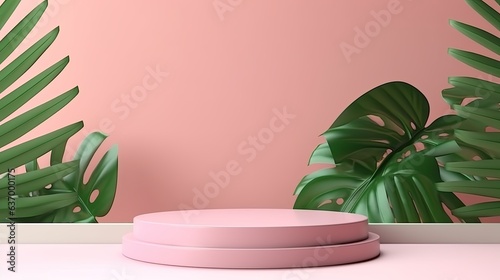 pink colour podium display stand showcase mockup backdrop for product display template with light shadow and copyspace for advertisment concept,ai generate