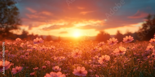 pink, flower, field, sunset, sky, orange, red, yellow, green, nature, summer, evening, light, sun, blossom, bloom, flower petals, leaf, stem, beauty, landscape, gold, warm, vibrant, soft, delicate, natural, outdoors, bright, background, glow, horizon, distant, closeup, view, scene