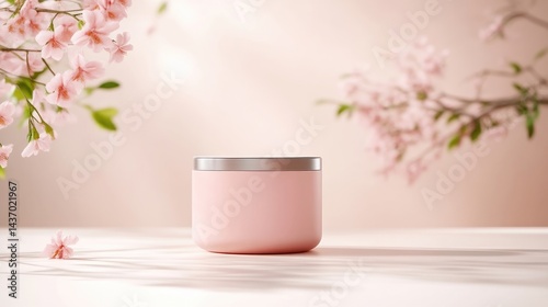 pink, cream, jar, container, cosmetic, product, beauty, spring, blossom, flower, cherry, bloom, pastel, soft, delicate, elegant, feminine, gentle, subtile, rose, light, bright, shiny, smooth, silvery, lid, metal, round, cylindrical, minimalist, simple, clean, pure, fresh, natural, organic, spa, relax, care, wellness, serenity, calm, tender, peach, reddening, quiet, peaceful, tranquil, softness