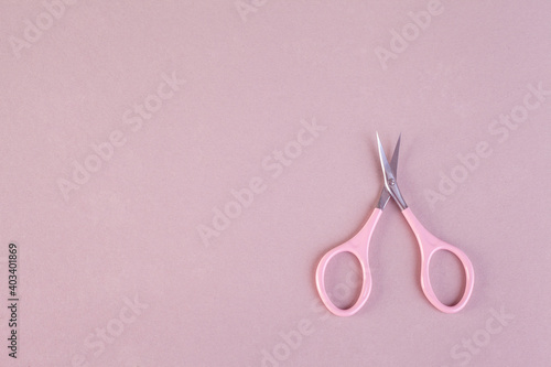 Pink cuticle scissors on pink background flat lay copy space. Metal and plastic nail scissors. Manicure scissors.