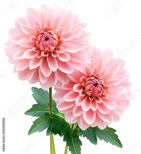 Pink dahlia flowers with vibrant green leaves and grass, beautifully isolated on a crisp white background.