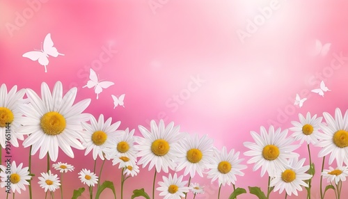 Pink daisies and butterflies fluttering in a colorful spring garden, romantic banner