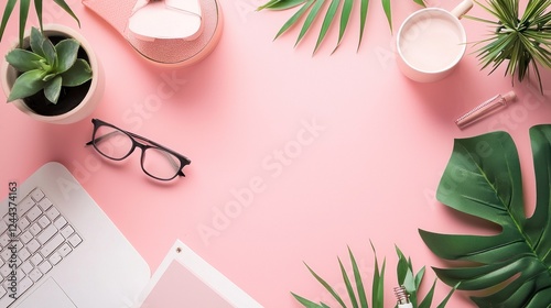 laptop, pink, leaf, workspace, desk, tropical, plant, goggles, mug, notebook, stylus, office, aesthetic, summer, minimalism, clean, modern, organised, background, pastel, feminine, stylish, technology, accessory, home, decor, flora, beauty, wellness, creative, design, inspiration, calm, serenity, relaxing, fresh, bright, elegant, lifestyle