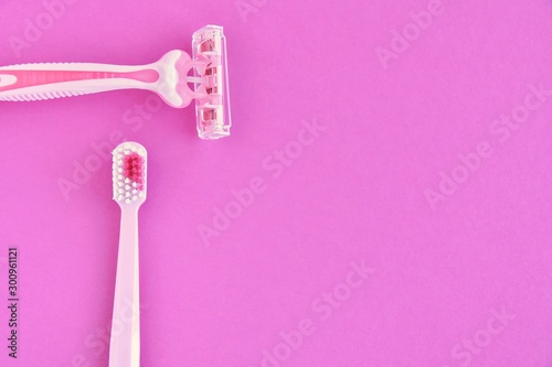 pink disposable razor for safe shaving of female skin and toothbrush with selective focus on purple background. Woman Razor and toothbrush on bright backdrop. Sharp razor for personal hygienic routine