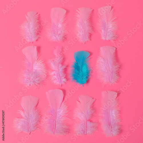Pink feathers and one turquoise feather on a pink rose background. Equality, diversity concept. Minimal style.