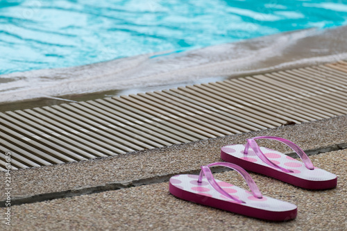 PINK FLIP FLOP BY THE EDGE OF SWIMMING POOL (The Image Has Shallow Depth Of Field)