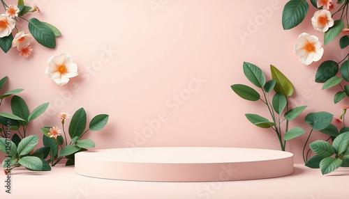 Pink floral display with a white background., Podium background flower cherry blossom, 3D platform with peonies for product