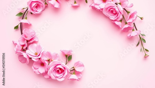 Pink floral wreath with hearts, pastel pink background, Valentine's Day , greeting, sweet