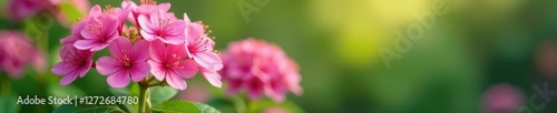 Pink flower clusters in soft focus with green foliage, blooming, floral, botanical